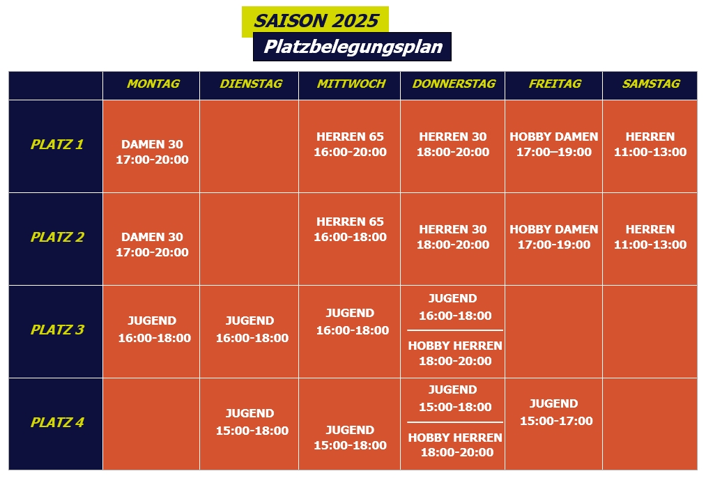 Im Online-Reservierungs-Portal kannst Du Dir einen Überblick verschaffen, zu welchen Zeiten die jeweiligen Mannschaften trainieren und welche Plätze hierfür reserviert sind.